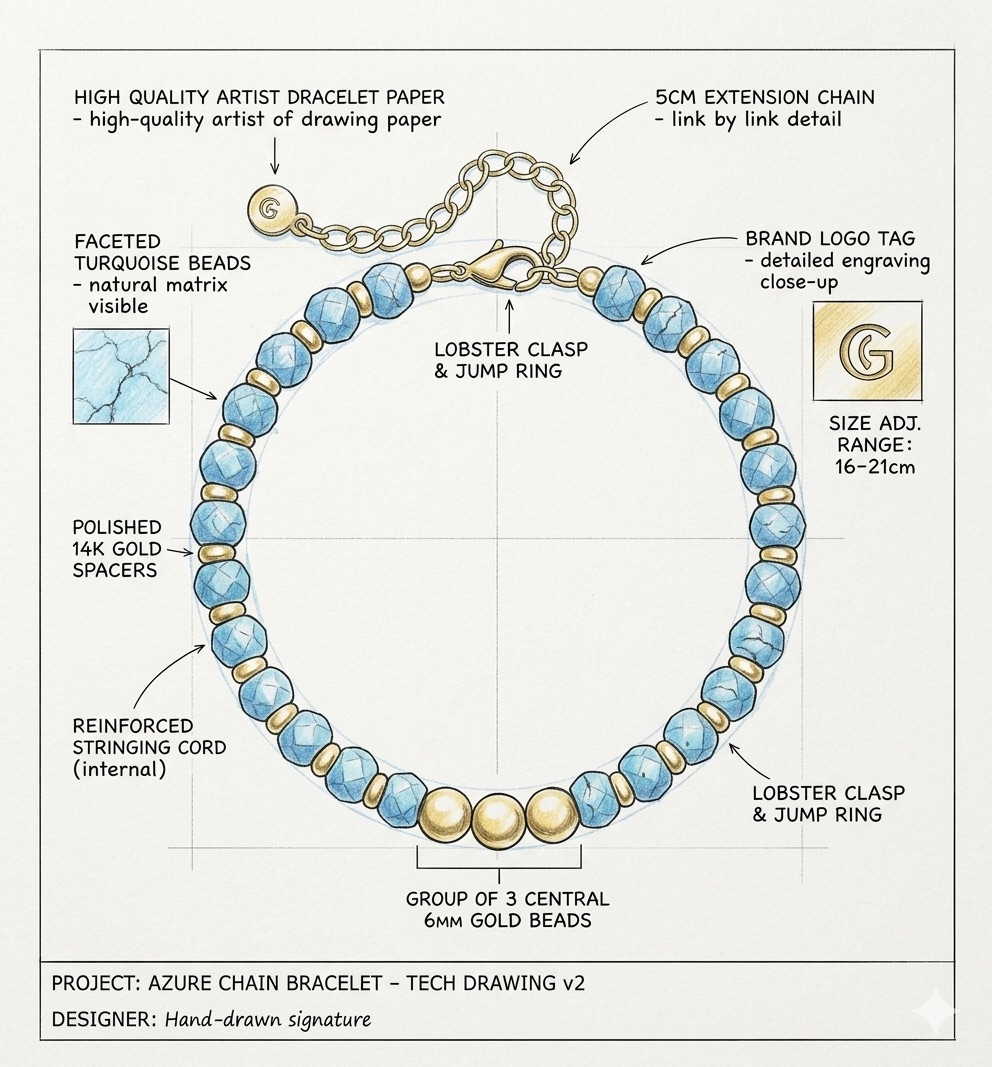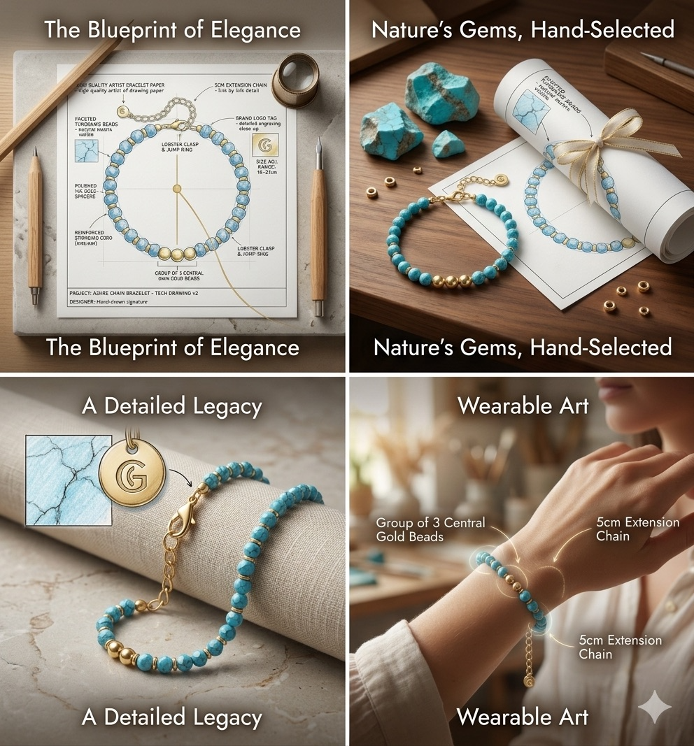 Dive into the vibrant hues of the Lumiara Azure Breeze Bracelet. This exquisite piece features hand-selected, faceted natural turquoise beads, accented by shimmering 18K Solid Gold beads. It is a celebration of natural beauty and artisan craftsmanship, designed for the woman who carries the spirit of summer with her all year round.